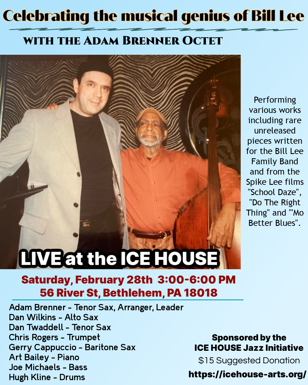 Back to All Events IceHouse Jazz Initiative - Celebrating the Musical Genious of Bill Lee Saturday, February 28, 2026 3:00 PM 6:00 PM IceHouse Performing Arts Collaborative 56 River Street Bethlehem, PA, 18018 United States (map) Google Calendar ICS