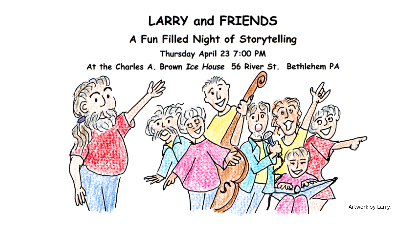 Join us for a fun-filled night of storytelling on Thursday, April 23, from 7pm to 10pm, at the Charles A Brown Ice House, Bethlehem, PA, featuring, from left to right, Larry Sceurman with Charles Kiernan, Denise McCormack, Geoff Fleming, Dave Howell, Ingrid Bohn, Nancy Scott, and Karen Maurer. The evening will be a celebration of creativity and community, and we hope to see you there!